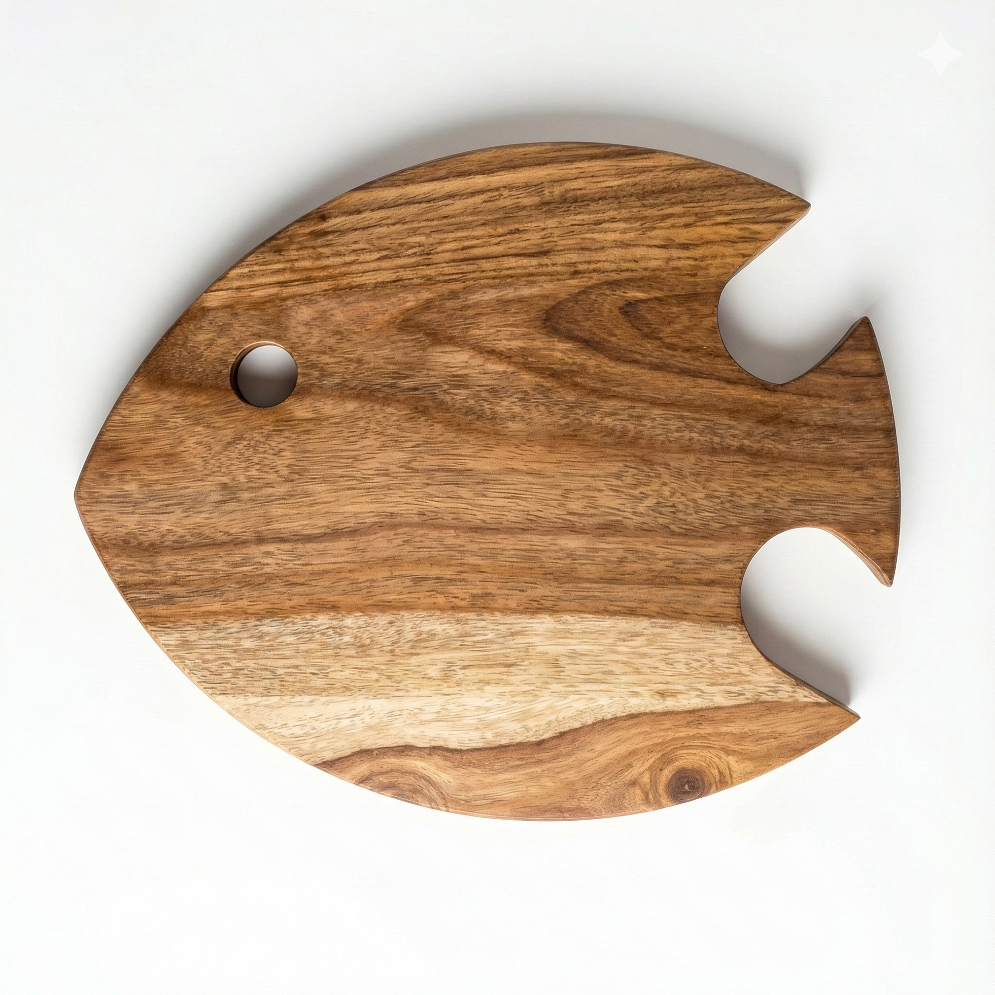 A sculpted wooden serving board inspired by the playful form of a fish, designed to add character and functionality to your table. Crafted from natural wood with smooth curves and distinctive cut-out details, it is ideal for serving cheeses, appetizers, nuts, or small bites in a unique and eye-catching way.