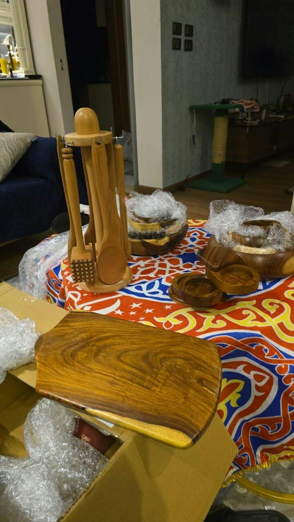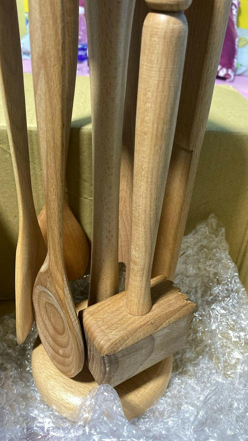 A complete set of essential wooden kitchen tools designed for everyday cooking and serving, neatly organized on a matching wooden stand. Crafted from durable natural wood, each piece is gentle on cookware and adds a warm, timeless touch to your kitchen.