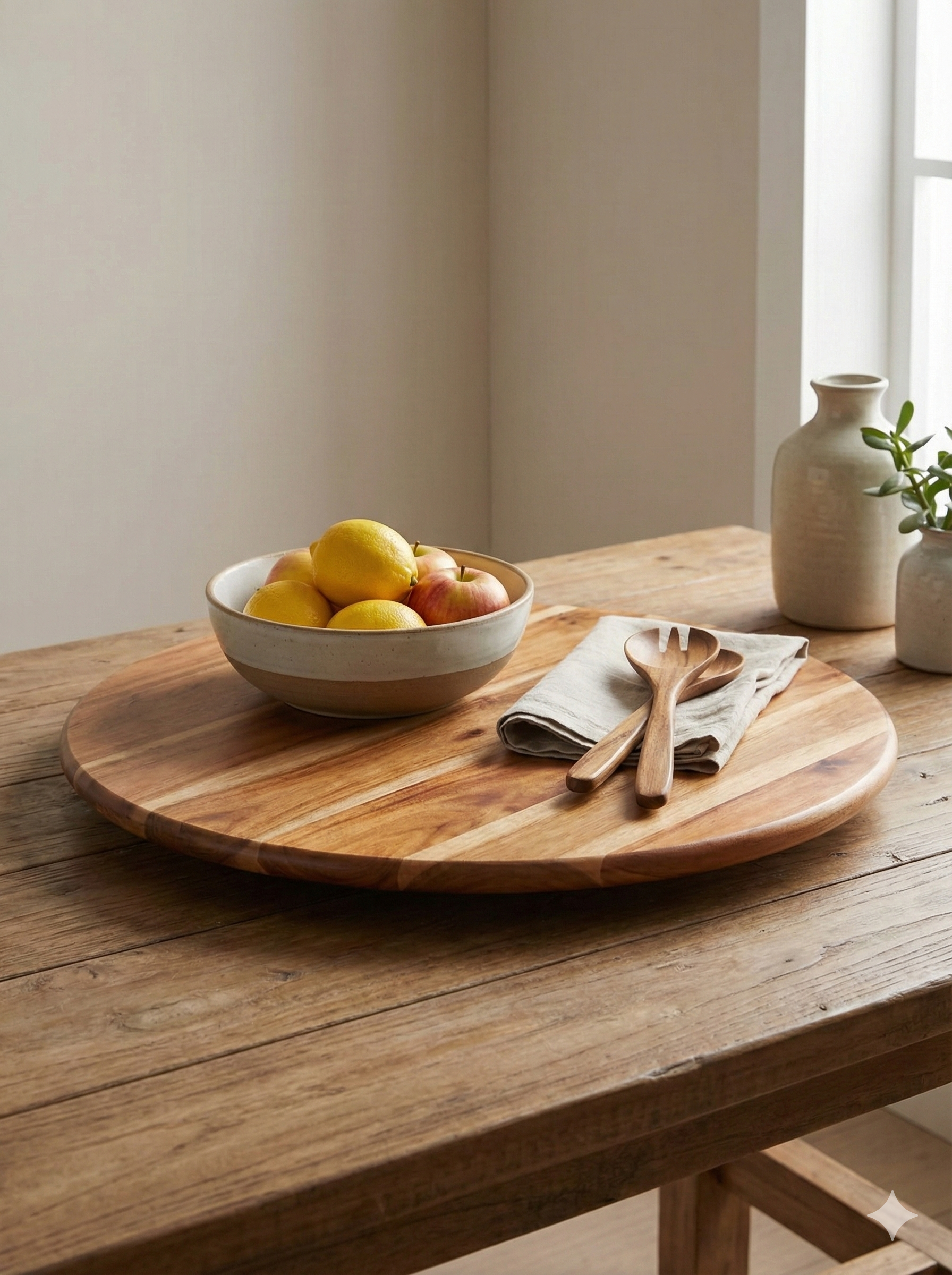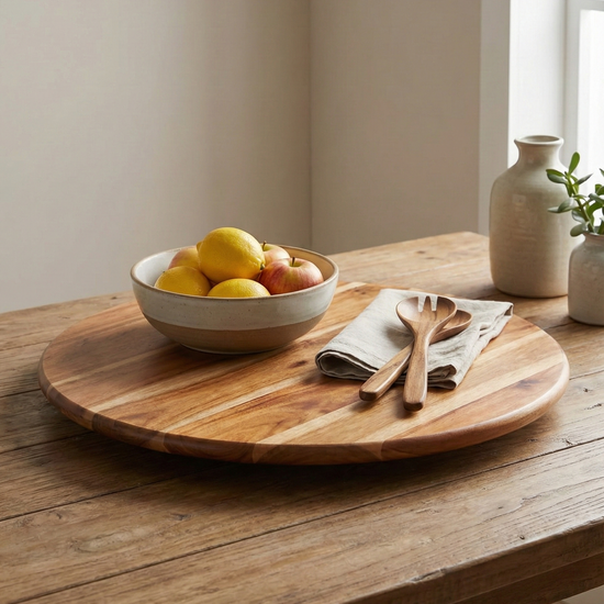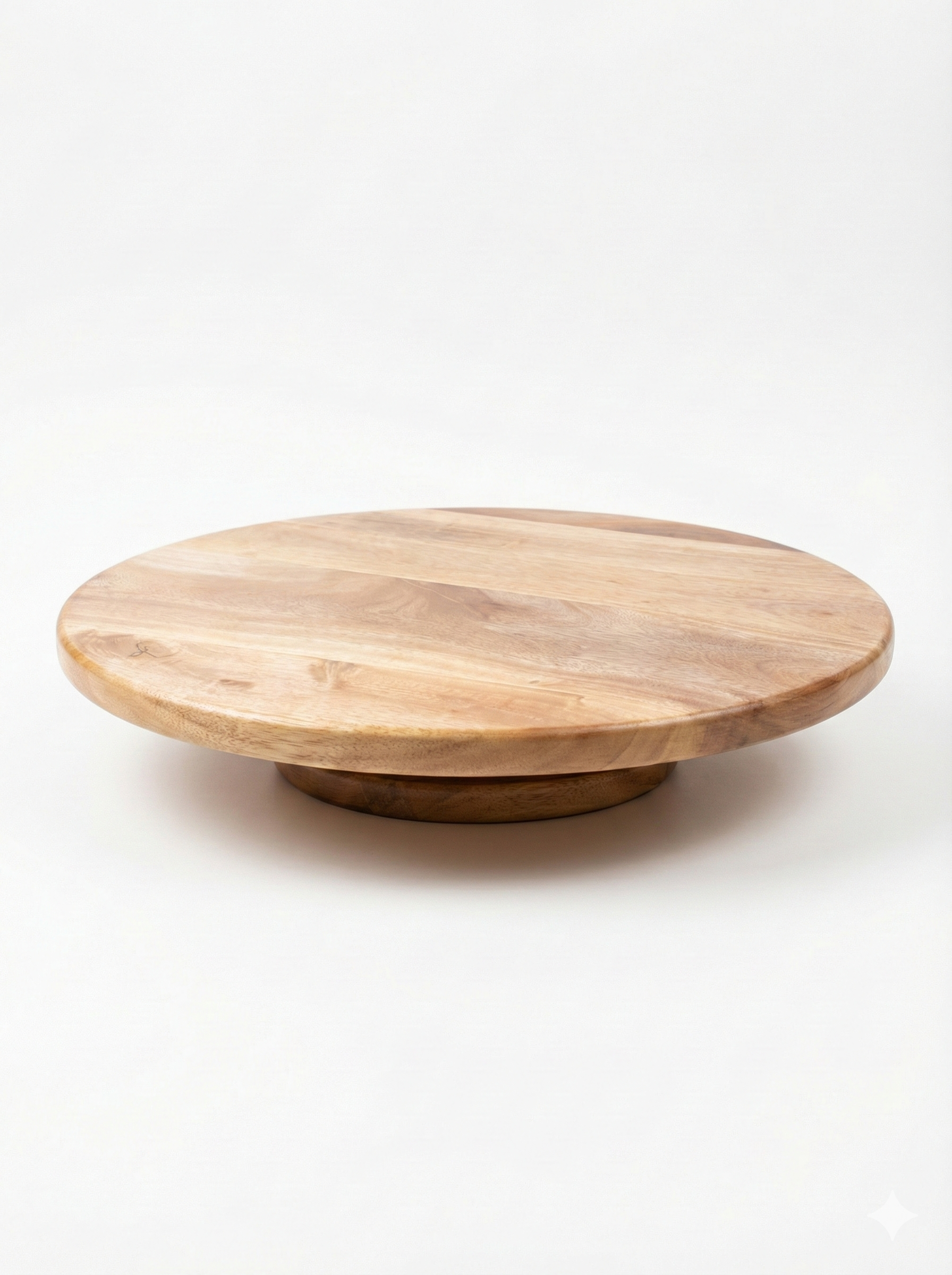 A spacious handcrafted wooden Lazy Susan with a smooth rotating base, designed for effortless serving. Its 50 cm diameter provides ample space while adding a warm, natural touch to any table.