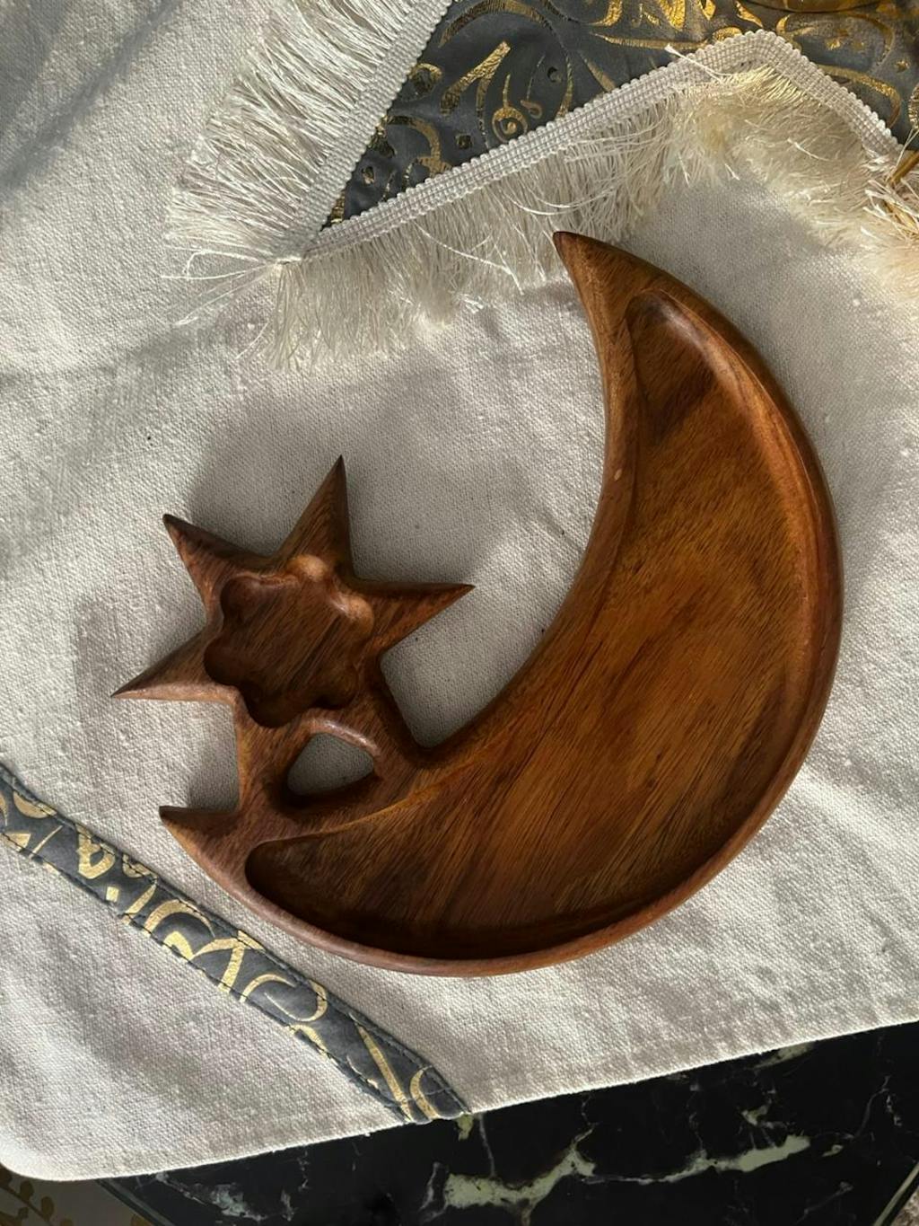 A handcrafted rosewood serving tray designed in a crescent moon with a star, inspired by timeless Ramadan symbolism and celestial beauty.