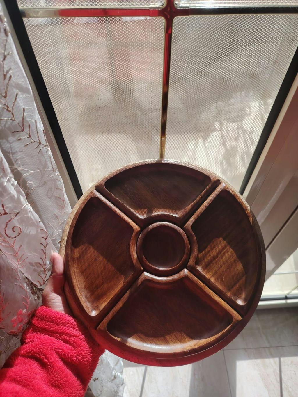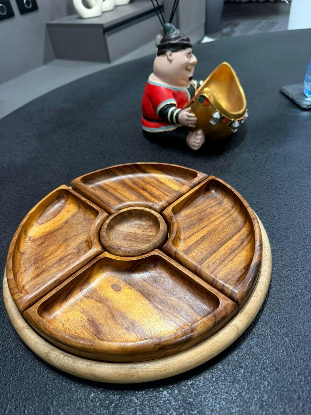 - A timeless round serving platter featuring five fitted wooden sections and a central circle — ideal for showcasing an assortment of nuts, snacks, or dates in a warm, minimal presentation.